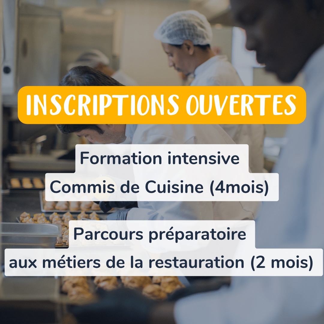 Notre formation intensive de commis de cuisine sur 4 mois est ouvertes aux personnes réfugiées à partir de 18 ans, pour découvrir les métiers de la restauration, préparer son entrée dans l’emploi, et obtenir un double diplôme : un diplôme métier et un diplôme de français.