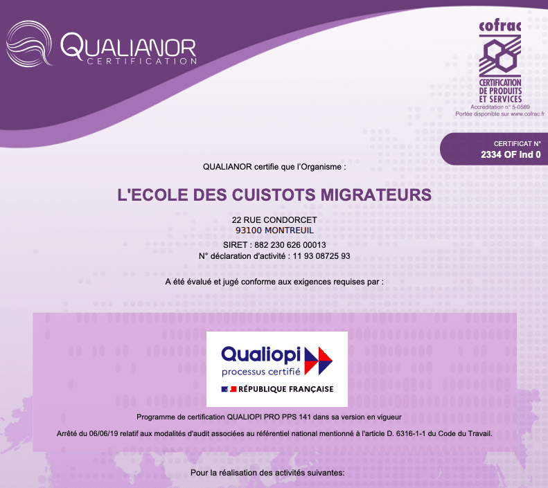 Nos formations sont doublement diplômantes. Elles débouchent sur un certificat métier de niveau CAP (Titre à finalité professionnelle ) et un diplôme de compétence en langue française (DCL).